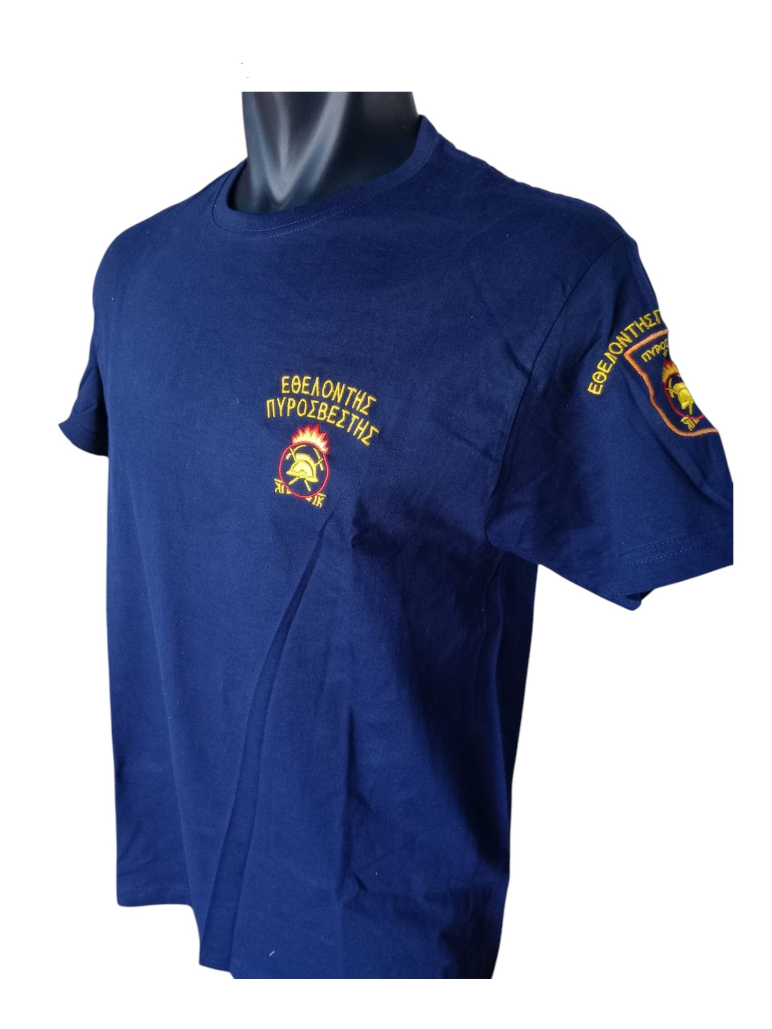 Μακό μπλουζάκι, βαμβακερό 100%, εθελοντή πυροσβέστη με κεντημένα όλα τα προβλεπόμενα διακριτικά.