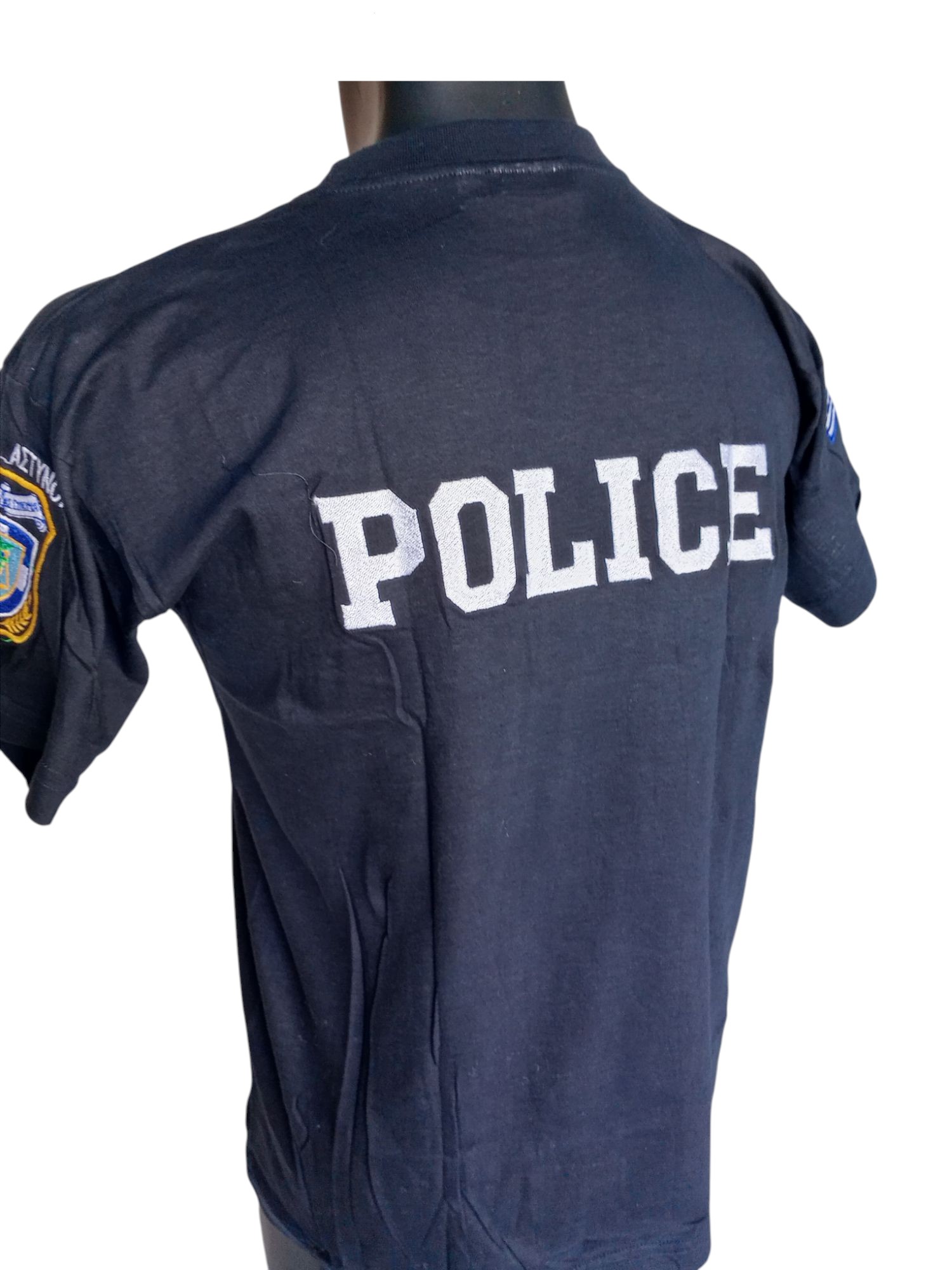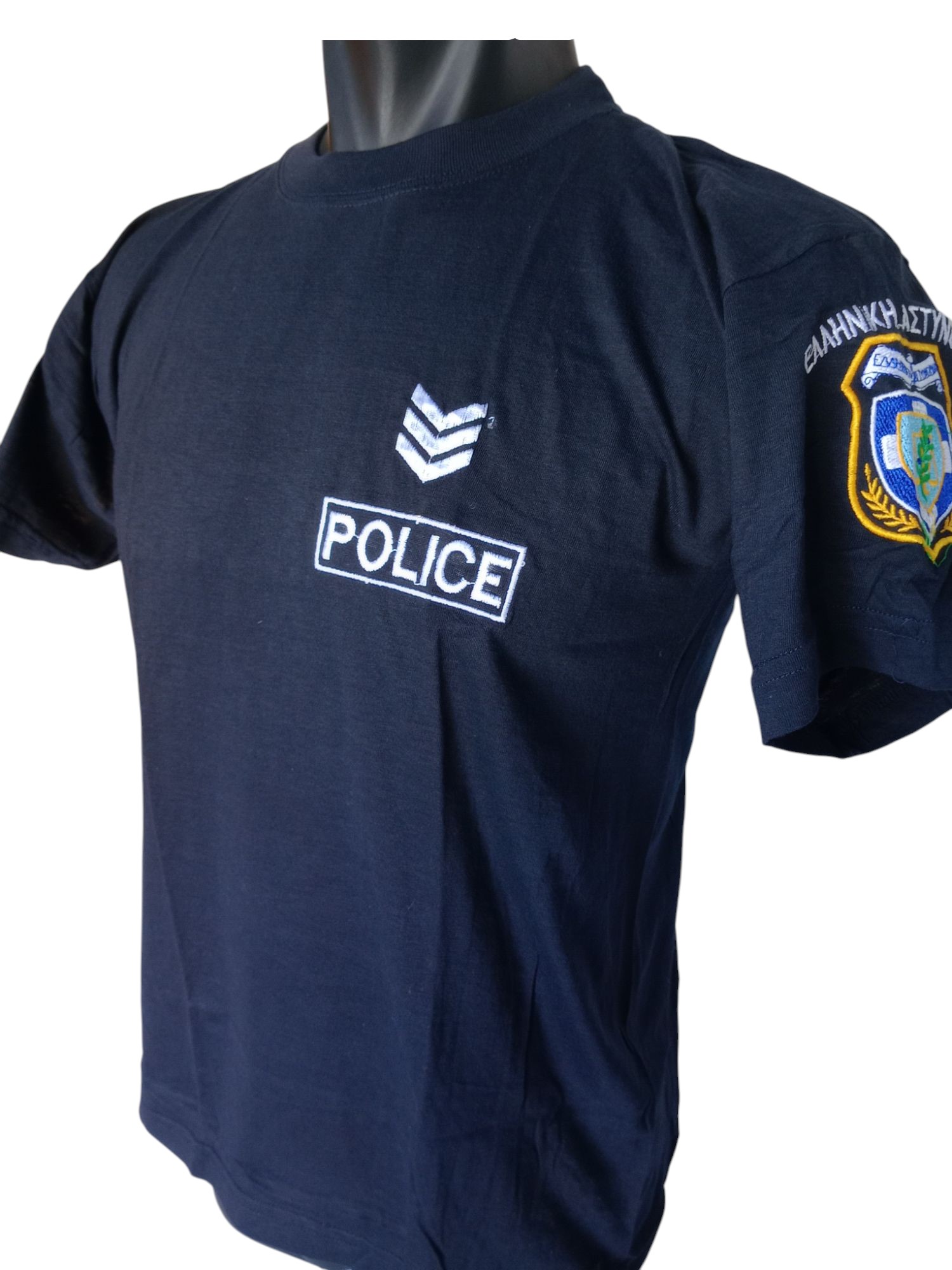 Βαμβακερή μπλούζα με κοντό μανίκι η οποία έχει κεντημένα με άσπρη κλωστή τα προβλεπόμενα διακριτικά της ελληνικής αστυνομίας στο μπροστινό μέρος και το σήμα Police στο πίσω.