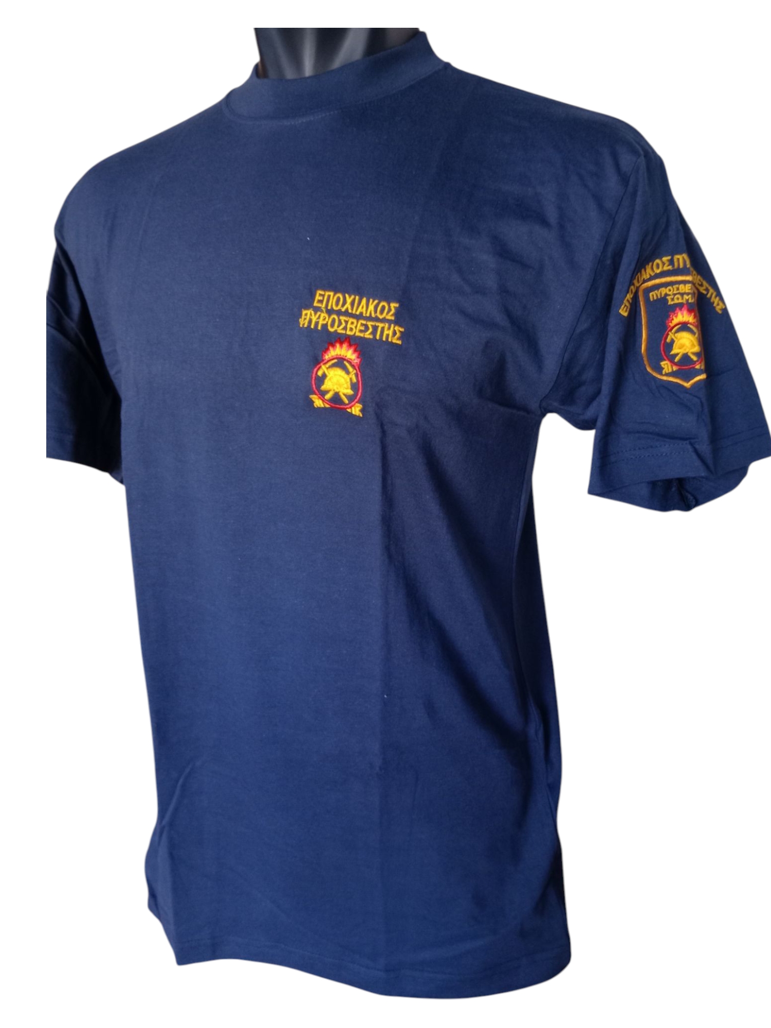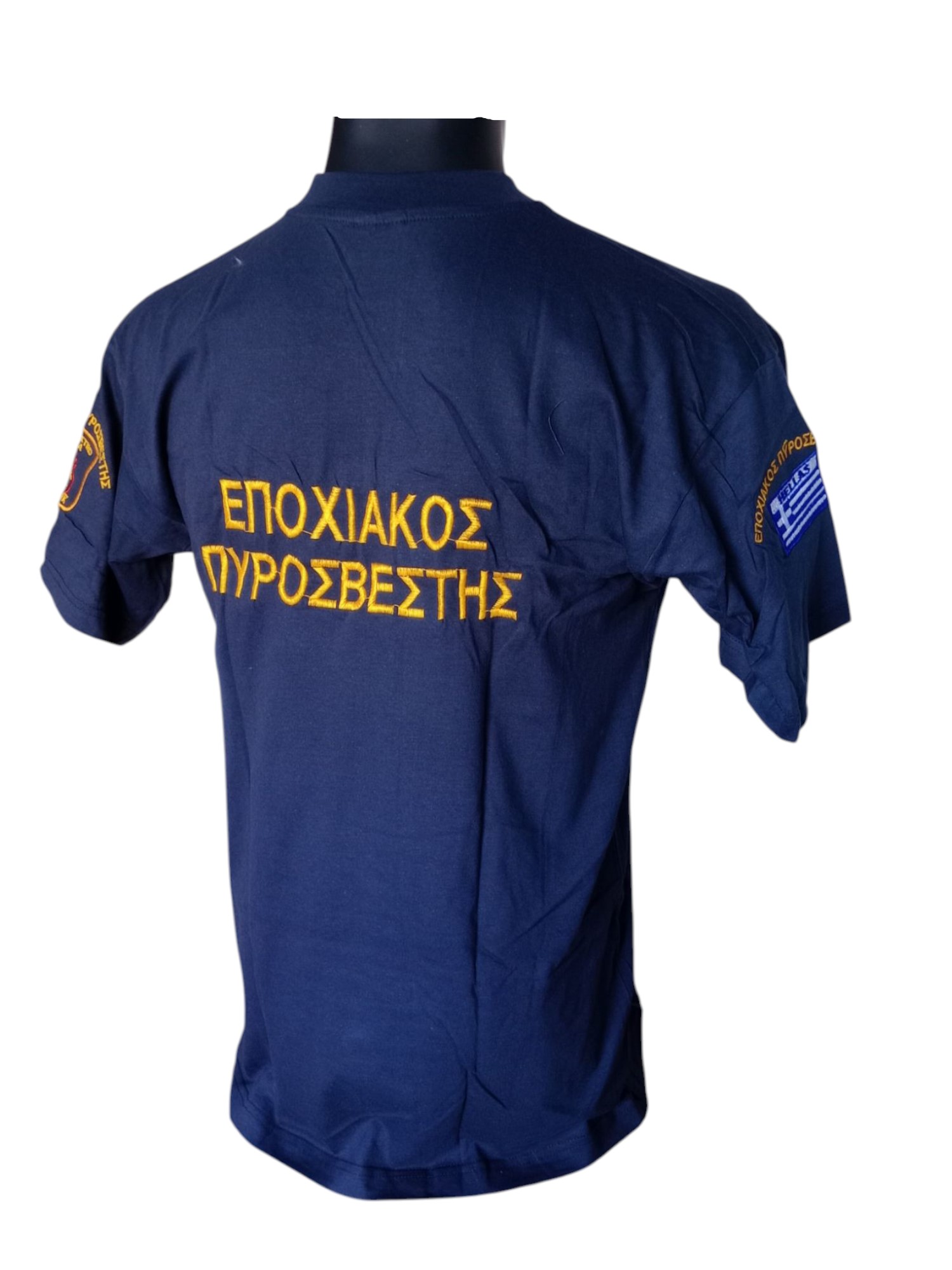 Μακό μπλουζάκι, βαμβακερό 100%, εποχιακού πυροσβέστη με κεντημένα όλα τα προβλεπόμενα διακριτικά.